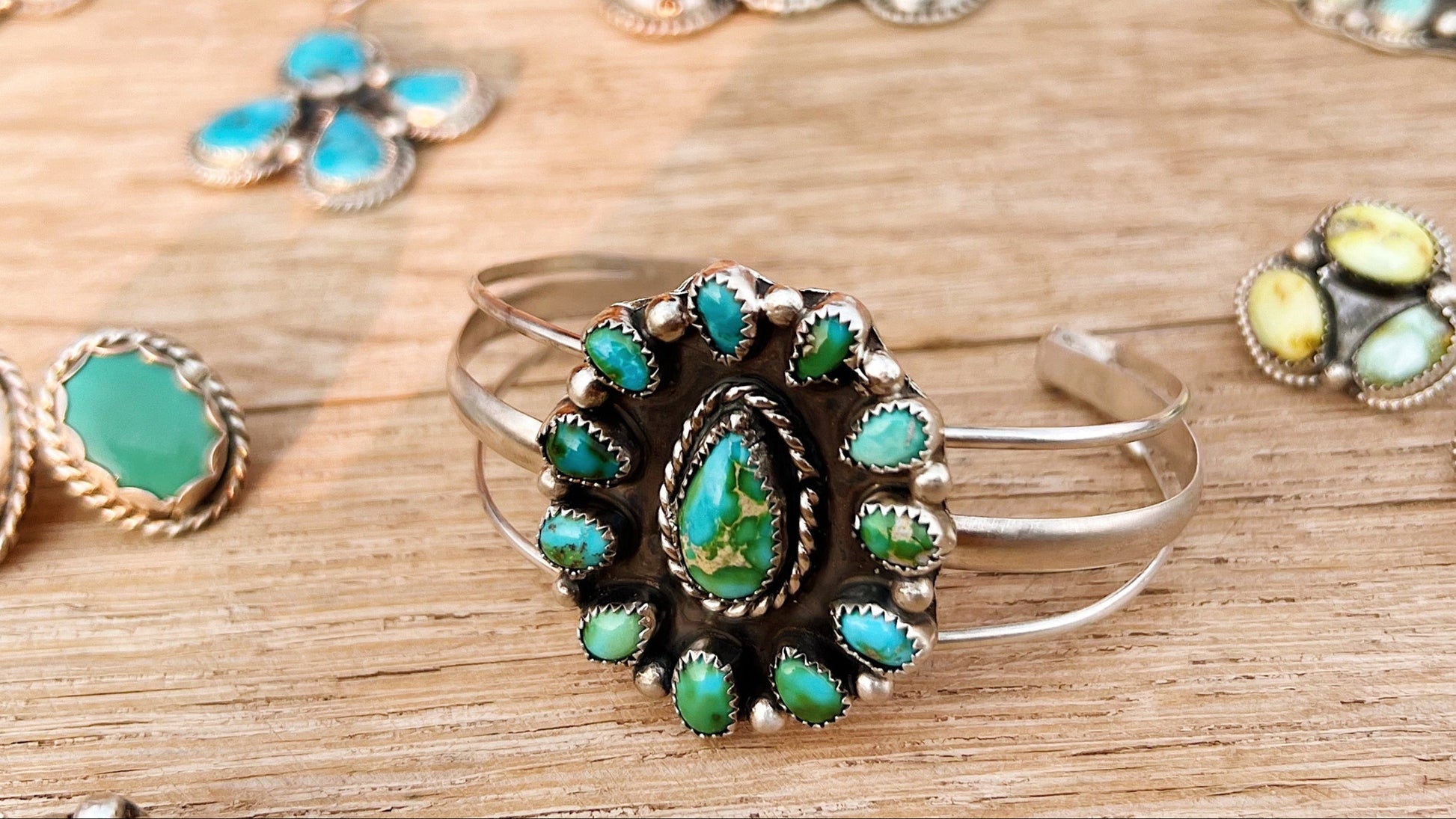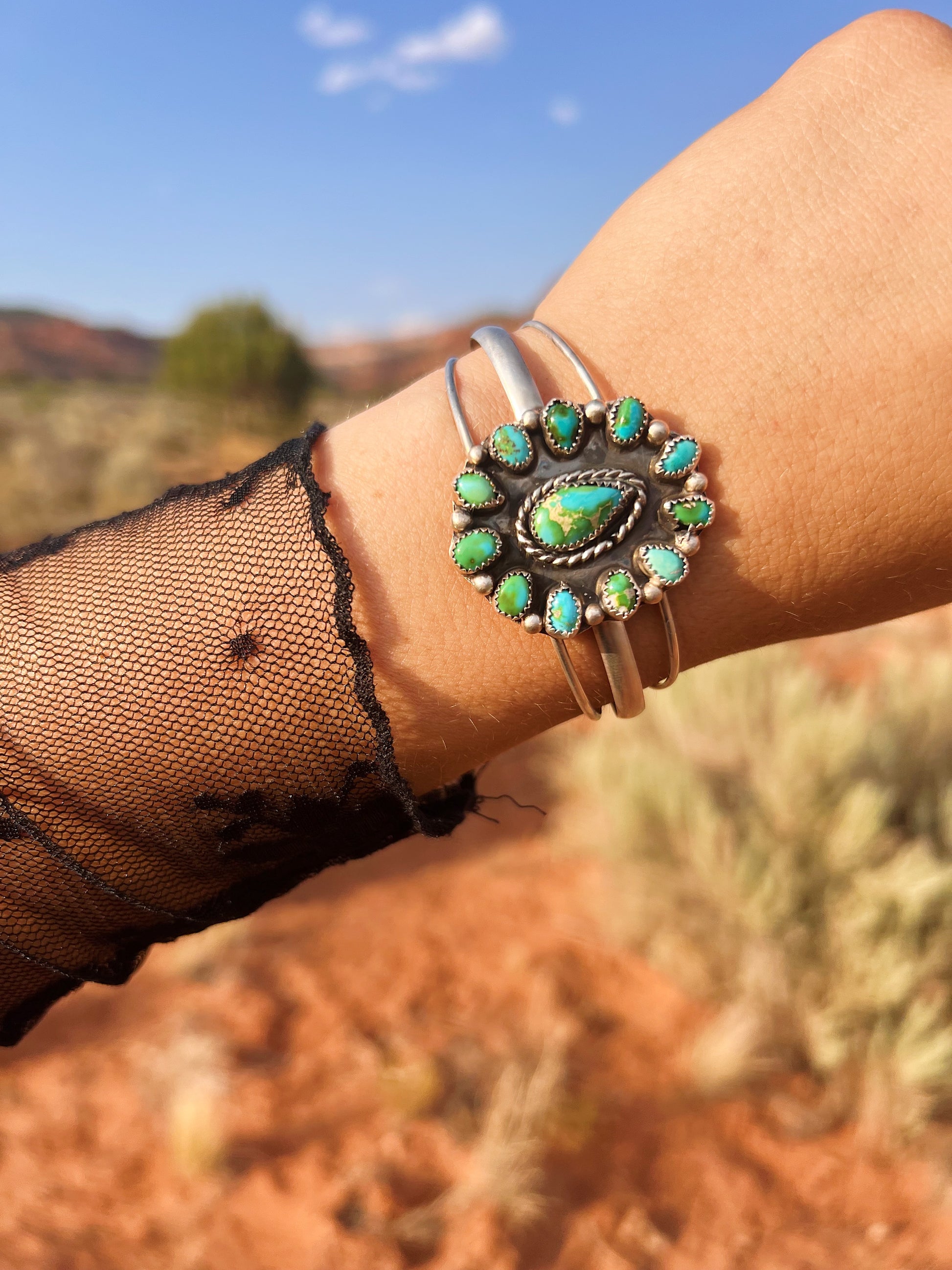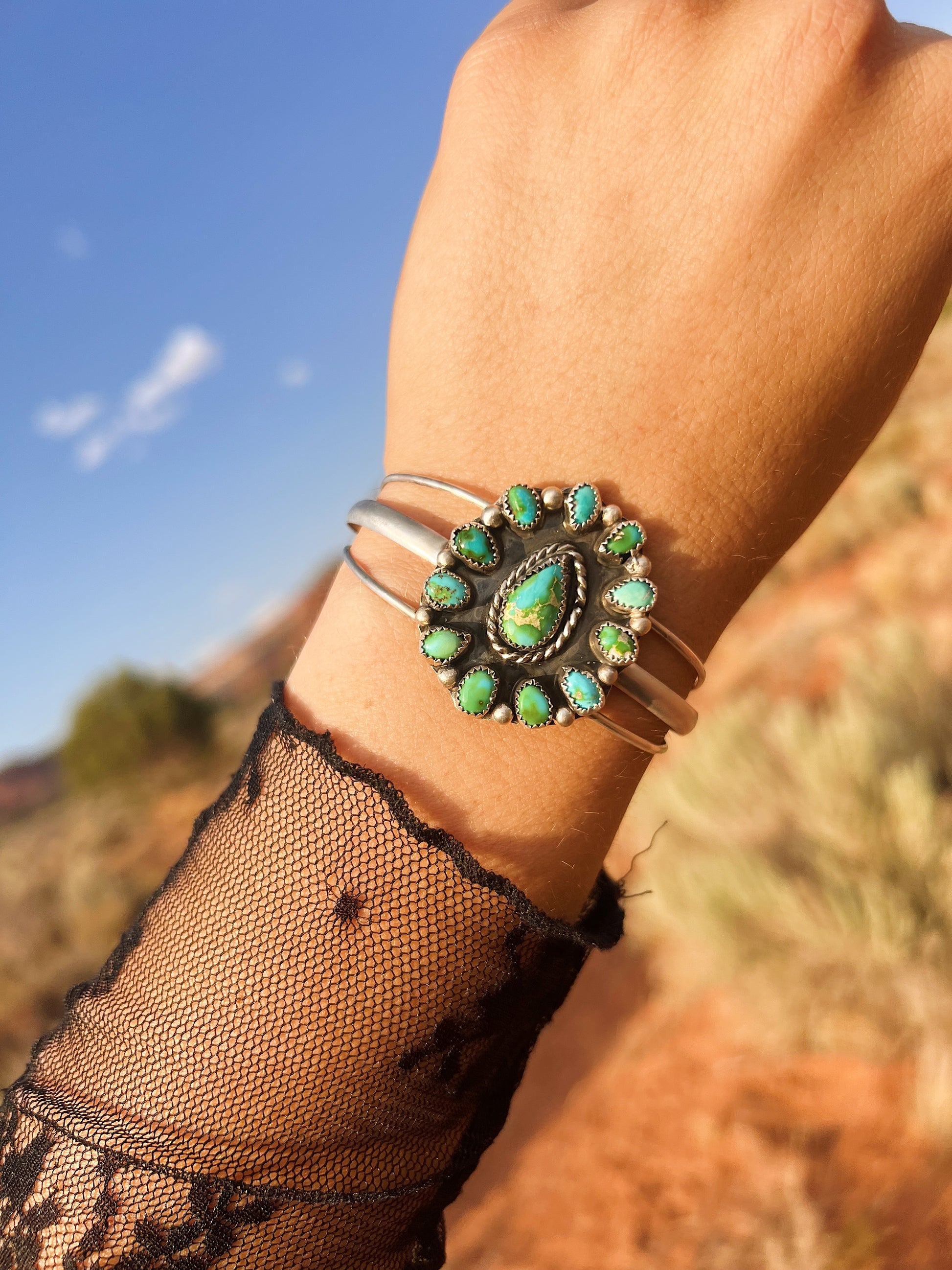 Made with high quality Sonoran Mountain Turquoise and 100% sterling silver. 5.5 inch band with a 1.5 inch opening. Fits small-medium wrist